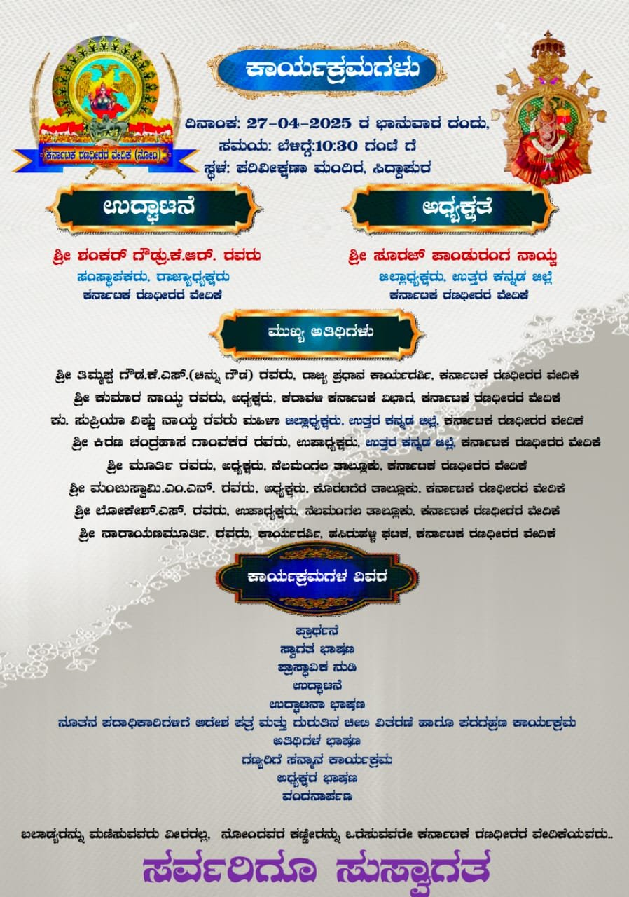 ಸಿದ್ದಾಪುರ – ಕರ್ನಾಟಕ ರಣಧೀರರ ವೇಧಿಕೆ(ರಿ)ಬೆಂಗಳೂರು ಕನ್ನಡ ಸಂಘಟನೆ ಯ ಉತ್ತರ ಕನ್ನಡ ಜಿಲ್ಲೆಯ ಸಿದ್ದಾಪುರ ತಾಲೂಕ ಘಟಕದ ಉದ್ಘಾಟನಾ ಕಾರ್ಯಕ್ರಮ ಮತ್ತು ಸಿದ್ದಾಪುರ ಪದಾಧಿಕಾರಿಗಳ ಪದಗ್ರಹಣ ಕಾರ್ಯಕ್ರಮ ವು ದಿನಾಂಕ 27/4/25 ರಂದು ರವಿವಾರ 10.30 ಕ್ಕೆ ಸಿದ್ದಾಪುರ ತಾಲೂಕಿನ ಪ್ರವಾಸಿ ಮಂದಿರದ ಸಭಾಂಗಣದಲ್ಲಿ ನಡೇಯಲಿದೆ ಎಂದು ಸಂಘಟನೆ ಯ ಸಿದ್ದಾಪುರ ತಾಲೂಕು ಅಧ್ಯಕ್ಷ ಮೋಹನ್ ಪಾಂಡುರಂಗ ನಾಯ್ಕ ತಿಳಿಸಿದ್ದಾರೆ.