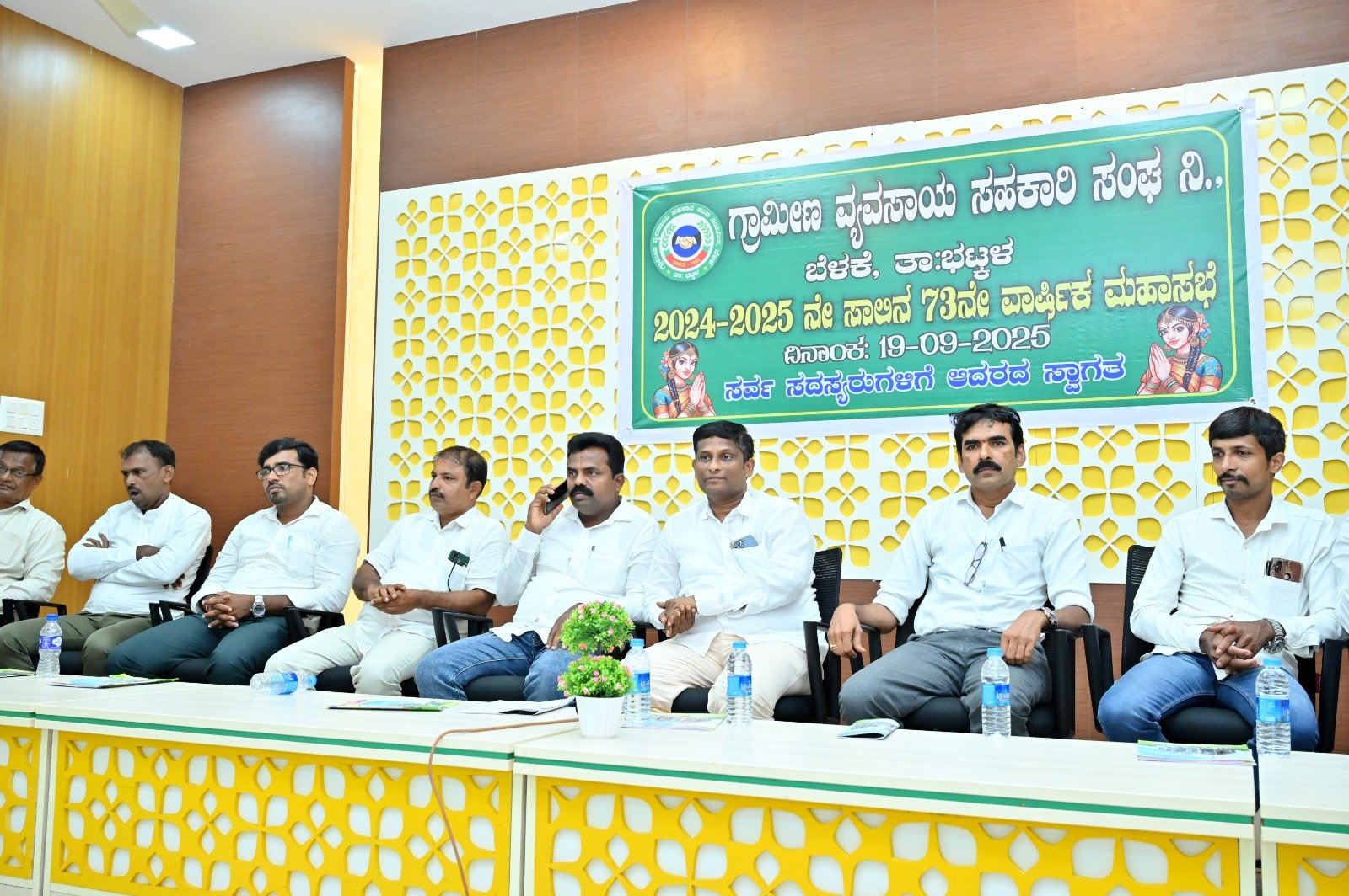 ಭಟ್ಕಳ: ತಾಲೂಕಿನ ಪ್ರತಿಷ್ಠಿತ ಪ್ರಾಥಮಿಕ ಕೃಷಿ ಪತ್ತಿನ ಸಹಕಾರಿ ಸಂಸ್ಥೆಗಳಲ್ಲಿ ಒಂದಾದ ಗ್ರಾಮೀಣ ವ್ಯವಸಾಯ ಸಹಕಾರಿ ಸಂಘ ನಿ. ಬೆಳಕೆ ಇದರ 73ನೇ ವಾರ್ಷಿಕ ಸಾಮಾನ್ಯ ಸಭೆಯು ದಿನಾಂಕ 19-09-2025 ರಂದು ಬೆಳಕೆಯಲ್ಲಿರುವ ಪ್ರಧಾನ ಕಚೇರಿಯ ಎಂ ಎಸ್ ನಾಯ್ಕ್ ಸಭಾಭವನದಲ್ಲಿ ನಡೆಯಿತು. ಸಂಘದ ಅಧ್ಯಕ್ಷರಾದ ಶ್ರೀ ಮಾದೇವ್ ಗೋವಿಂದ ನಾಯ್ಕ್ ಇವರು ಮಾರ್ಚ್ 2025 ಕ್ಕೆ ಅಂತ್ಯಗೊಂಡ ಹಣಕಾಸು ವರ್ಷದ ವರದಿಯನ್ನು ಮಂಡಿಸಿದರು.