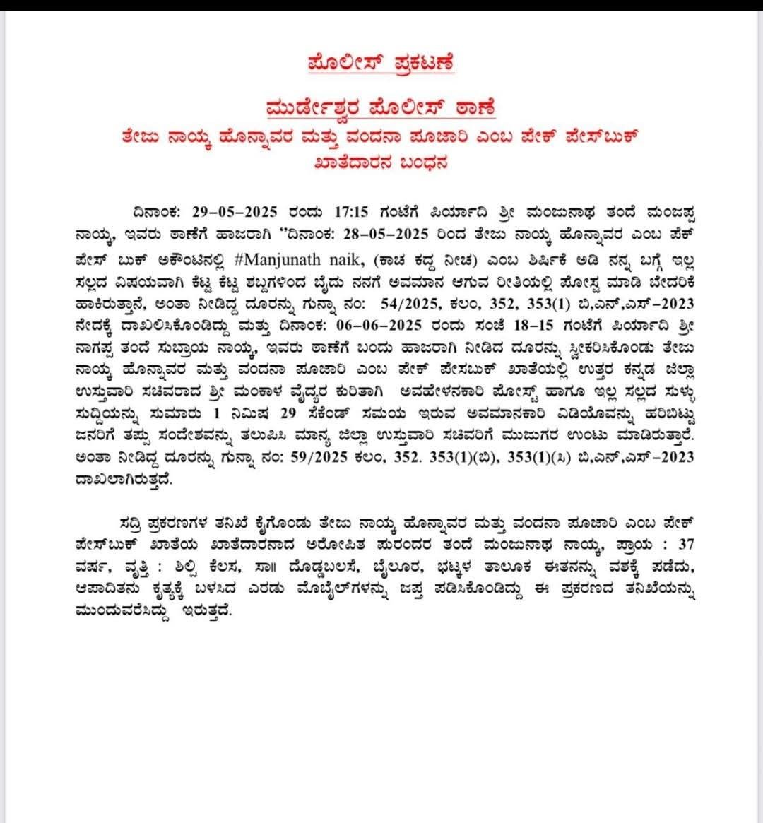 ಪೊಲೀಸರ ಪ್ರಕಾರ, ಆರೋಪಿಯು “ತೇಜು ನಾಯ್ಕ ಹೊನ್ನಾವರ” ಮತ್ತು “ವಂದನಾ ಪೂಜಾರಿ” ಎಂಬ ನಕಲಿ ಫೇಸ್ಬುಕ್ ಖಾತೆಗಳ ಮೂಲಕ ಈ ಪೋಸ್ಟ್ಗಳನ್ನು ಹಂಚುತ್ತಿದ್ದಾನೆ. ಕಳೆದ ಮೇ 29, 2025 ರಂದು ಮಂಜುನಾಥ ನಾಯ್ಕ ಅವರೇ ತಮ್ಮ ವಿರುದ್ಧ ಅಸಭ್ಯ ಶಬ್ದಗಳಲ್ಲಿ ಪೋಸ್ಟ್ ಮಾಡಲಾಗಿದೆ ಎಂದು ದೂರು ನೀಡಿದ್ದರು. ಬಳಿಕ ತನಿಖೆಯ ಸಮಯದಲ್ಲಿ, ಇದೇ ಖಾತೆಗಳಿಂದ ಜೂನ್ 6, 2025 ರಂದು ಸಚಿವ ಮಂಕಾಳ್ ವೈದ್ಯರ ವಿರುದ್ಧ ಸುಮಾರು 1.29 ನಿಮಿಷಗಳ ವಿಡಿಯೋ ಹಂಚಲಾಗಿರುವುದು ಪತ್ತೆಯಾಯಿತು.