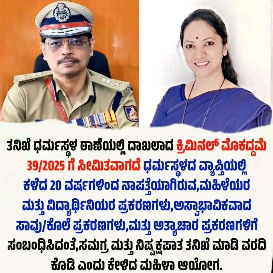 ಬೆಂಗಳೂರು- ಧರ್ಮಸ್ಥಳದಲ್ಲಿ ನೂರಾರು ಶವಗಳನ್ನು ಹೂತಿಟ್ಟಿದ್ದಾರೆ ಎಂಬ ಆರೋಪದ ಹಿನ್ನೆಲೆಯಲ್ಲಿ ಸರ್ಕಾರ ರಚಿಸಿರುವ ವಿಶೇಷ ತನಿಖಾ ತಂಡದ (ಎಸ್ಐಟಿ) ಕಾರ್ಯ ಈಗ ಅಂತಿಮ ಹಂತ ತಲುಪಿದೆ. ತಿಂಗಳುಗಟ್ಟಲೆ ನಡೆದ ತನಿಖೆಯ ನಡುವೆ, ಇದೀಗ ರಾಜ್ಯ ಮಹಿಳಾ ಆಯೋಗವೂ ಈ ಪ್ರಕರಣದ ಕುರಿತು ಅಧಿಕೃತವಾಗಿ ಹಸ್ತಕ್ಷೇಪ ಮಾಡಿದೆ.
